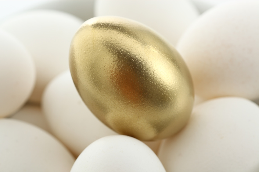 das goldene Ei Weiter → ein goldenes Ei auf weissen Eiern in einer Porzellenschale ,Symbolfoto mit vergoldetem Huehnerei. Nahaufnahme, Das goldene Ei – zeig deine Einzigartigkeit, Rechte: fotolia/redhorst